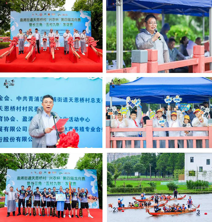 天恩桥村“兴农杯”龙舟村赛是上海市首个农村自筹自建自办的龙舟比赛,已连续举办四年,每年有近30支队伍参加,成为乡村文化的一张亮丽名片。今年的“兴农杯”赛事升级,不仅有本村21支生产小组之间的激烈竞争,还有来自盈浦街道辖区南横村、南厍村、俞家埭村、贺桥村等兄弟村庄的踊跃参与,更特邀了长三角地缘毗邻的7支队伍加入,共同角逐“五村九联”友谊赛的荣誉。